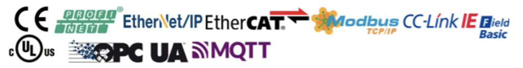 • Suporte de multiprotocolo – PROFINET, Ethernet/IP, EtherCAT, ModbusTCP, or CC-Link bem como protocolos IOT tais como OPC/UA, MQTT, CoAP, or REST AP